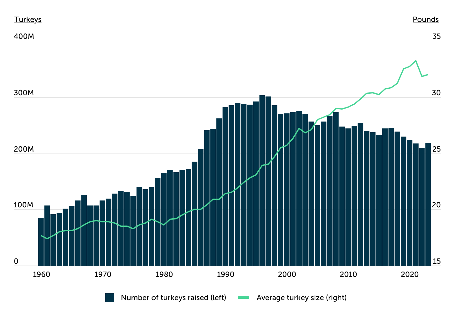 The average turkey size in the United States has undergone a remarkable transformation over the past several decades. Since the 1960s, the typical weight of a turkey has nearly doubled, soaring from 18 pounds to an impressive 32 pounds. This substantial increase plays a pivotal role in sustaining production levels, even as the total number of turkeys has experienced a 30% decline. Not only does this shift benefit farmers and suppliers, but it also reshapes consumer options during peak seasons like Thanksgiving and other festive occasions.